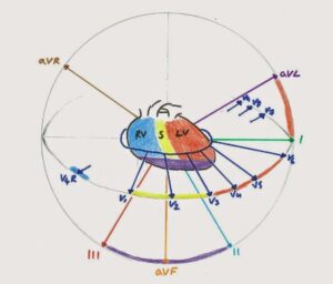 Electric signals of the heart spread in all directions. However each standard lead can accurately represent only a small spatial sector around its axis (axes are shown as green arrows). When projected onto an imaginary sphere surrounding the heart, such a conic sector would look like a small circle or an oval.